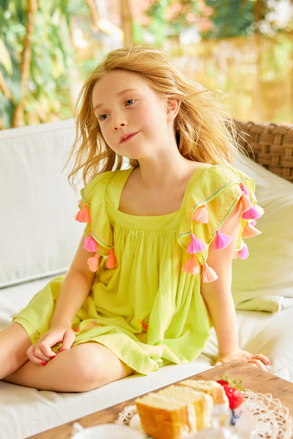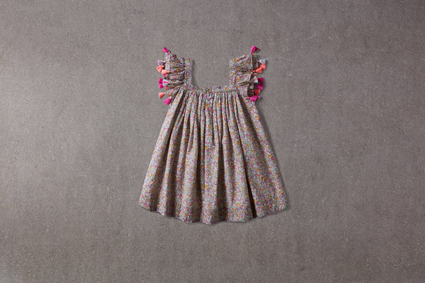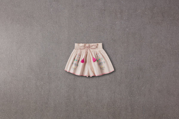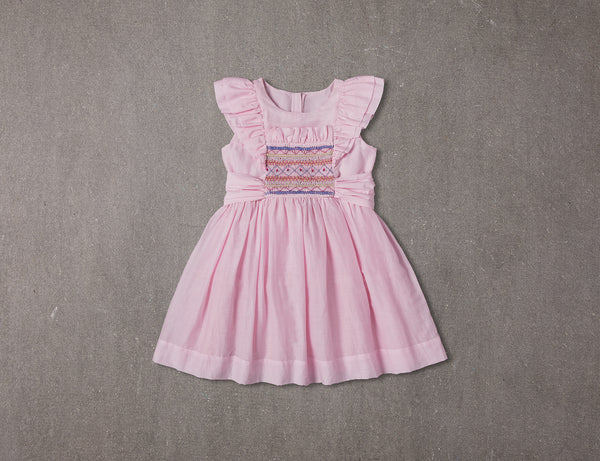 Above knee peach cotton birthday dress with floral embroidery and smocking