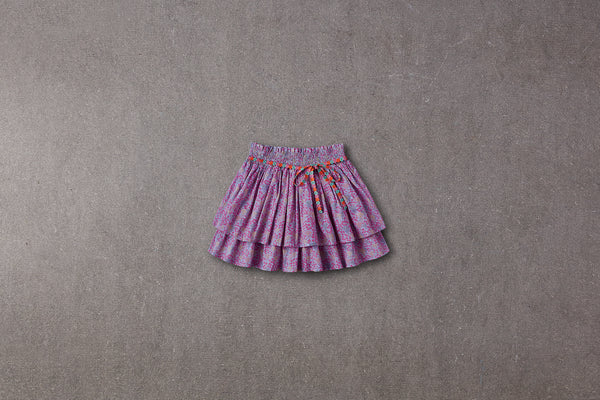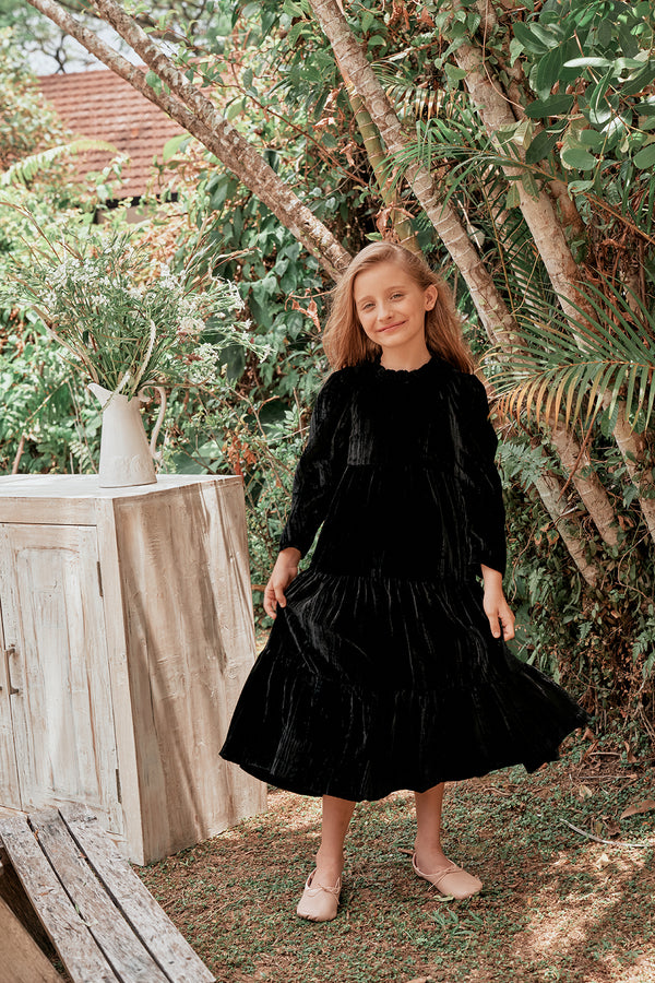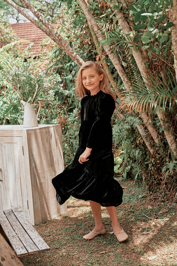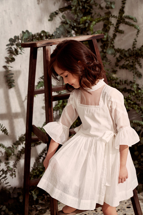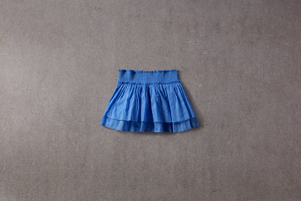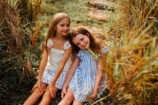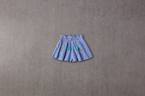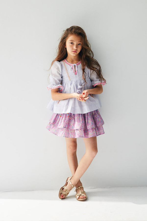 Flower girl dress with embroidered puffed sleeves in blue tulle