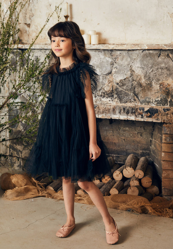 러플 디테일 블랙 튤 플라워 걸 드레스